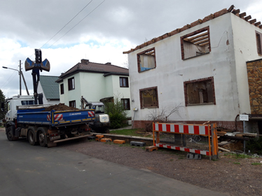 Vor dem Grundstück stehen ein Kipperfahrzeug mit frischem Erdaushub und ein kleiner Bagger, der zwei tiefe Löcher in das Erdreich gegraben hat. Die lang ersehnte Tagesaufgabe war, die verborgenen alten Versorgungsleitungen der Städtischen Werke Magdeburg freizulegen, um sie von ihren Quellen zu trennen, bevor die nächsten Arbeitsschritte eingeleitet werden können.