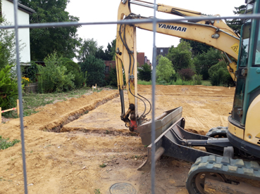 Kaum lag der Sand glatt auf der Baustelle, kam schon wieder ein Bagger und buddelte einen großen viereckigen Graben um die bereits geebnete Oberfäche. Auch Laien können vermuten, dass die schwere Bordenplatte, die bald das ganze Haus aufnehmen soll, eine stabile Auflage für die tragenden Außenwände braucht.