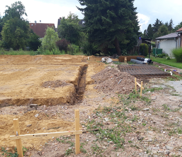 Besonders interessierten Zaungästen fiel sicher auch auf, dass an der rechten Grundstücksgrenze im unteren Bild Eisengitter abgelegt wurden. Wahrscheinlich handelt es sich hier um eine geplante Armierung zur Verstärkung der Bodenplatte, die zur Erhöhung der Tragfähigkeit des Hauses beitragen soll.
