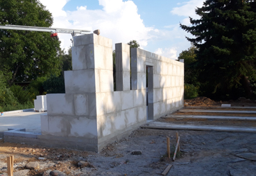 Und neben der Westwand des Hauses sieht man immer noch die Streifenfundamente zur Aufnahme der geplanten Fertigteilgarage. Wahrscheinlicht führt ja die erwähnte Tür ja auch direkt vom Haus in die zukünftige Garage, damit man nicht nass wird, wenn man zum Auto geht.