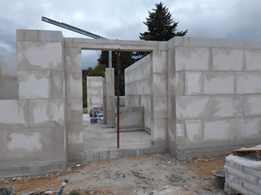 Nachdem die Außenwände des Erdgeschosses fest stehen, konnte man in den letzten Tagen durch die zukünftige Haustür beobachten, dass hinter den Außenmauern nun Innenwände entstehen. Den genauen Grundriss des Hauses kennt natürlich nur der Bauherr. Aber auch die Passanten können nun ahnen, dass jetzt die Innenarchitektur des Hauses mit jedem Tag neue Formen annimmt.