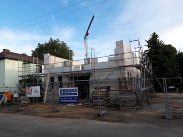Wieder eine Arbeitswoche geschafft. Bis heute wurden mit Hilfe des Drehkranes, der fest auf der Decke des Erdgeschosses steht, weitere große Steine in Position gebracht. Das Obergeschoss wurde an der Ost- und Westseite des Baus erkennbar aufgestockt, wie man von der Straßenseite aus deutlich sehen kann. Auch an der Hausfront geht das Baugeschehen voran.