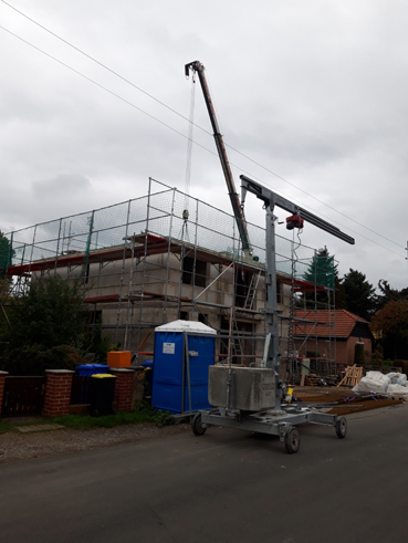 Auf den zweiten Blick erkennt man sogar zwei Krane (oder heißt es besser Kräne?). Den kleinen Kran im Vordergrund kennen wir schon. Er stand zuletzt auf der Decke des Erdgeschosses, um die Bausteine für das Obergeschosses zu bewegen, die auch der stärkste Bauarbeiter hätte nicht mit Muskelkraft an den Ort seiner Bestimmung bringen können.