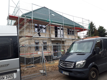 Etwa 10 Tag nach unserm Foto von der fertigen Eindeckung des Daches blickt das Haus nun mit großen Fensteraugen auf die Straße.