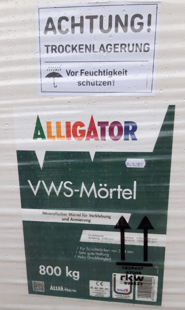 So erfährt man zum Beispiel, dass die Dämmplatten mit Mörtel der Marke ALLIGATOR an den Steinen der Außenwände befestigt werden und dass man den Mörtel trocken lagern mus, damit er nicht fest wird, bevor er verarbeitet werden soll. Im Internet steht, dass die mineralische Klebe- und Spachtelmasse zum Verkleben von Mineralwolle- und Polystyroldämmplatten geeignet ist